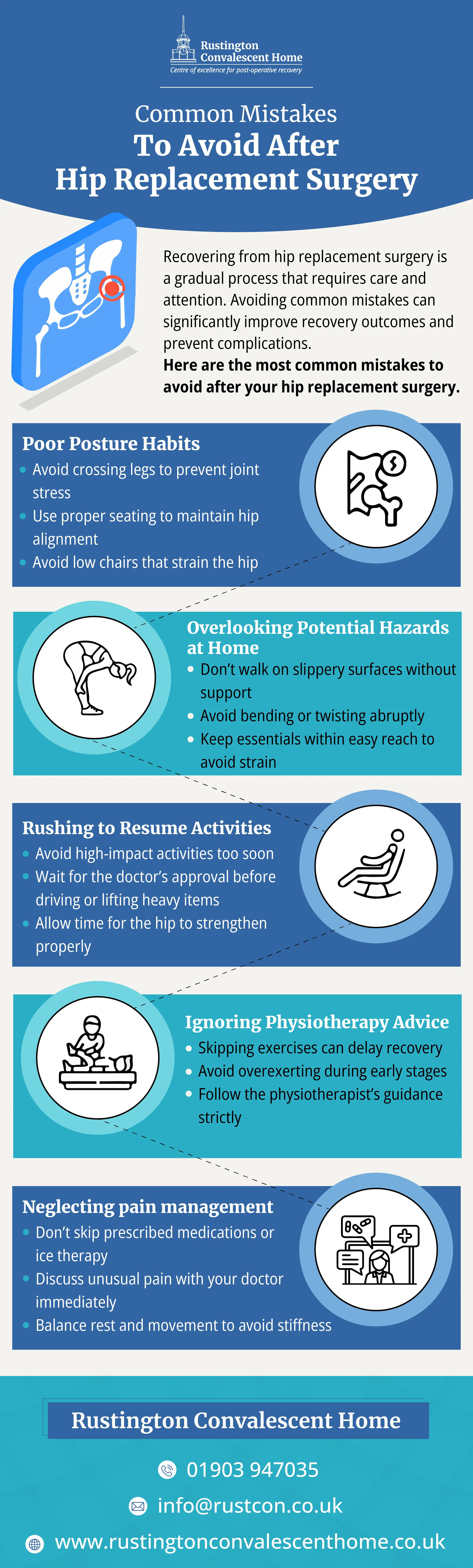 A person’s life can be changed by undergoing a hip replacement treatment. It can reduce chronic pain and improve mobility. Post-operative care and rehabilitation are crucial to the overall success of the procedure and the patient’s recovery. In addition to discussing the importance of post-operative care, this blog will outline ten common mistakes patients should avoid while recovering after hip replacement surgery. We will also go through the advantages of recovering at Rustington Convalescent Home.